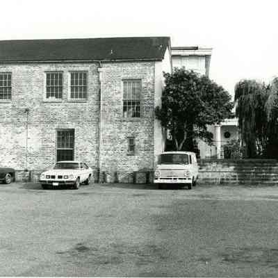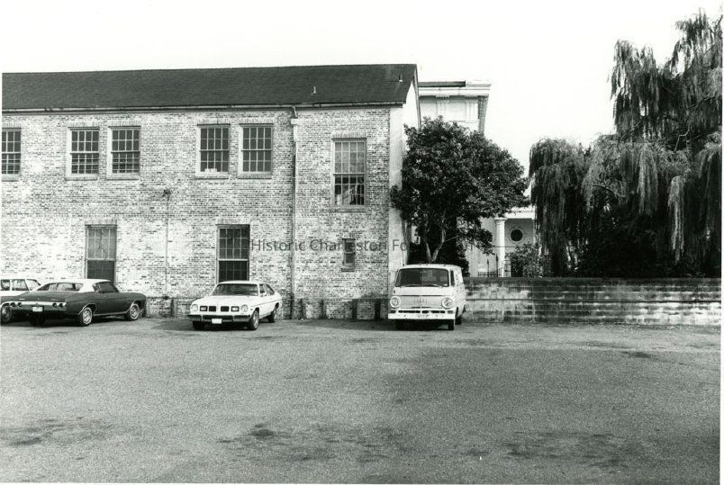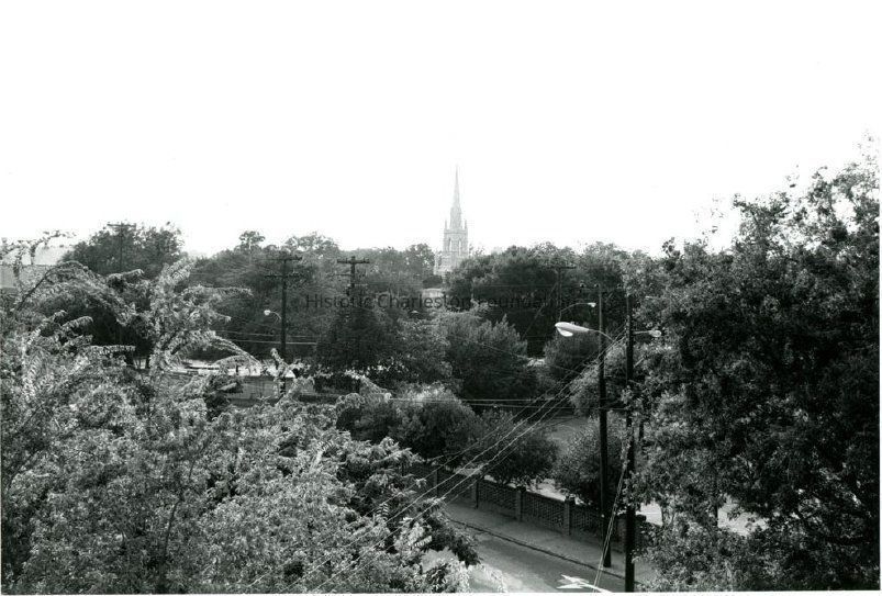 q: Looking east on Hasell Street from the C. B. Prentiss & Co. Customer Parking Lot and 95 Hasell Street (St. Mary’s Roman Catholic Church). 87 Hasell and 85 Hasell also in view at left.