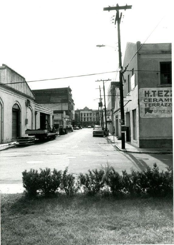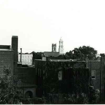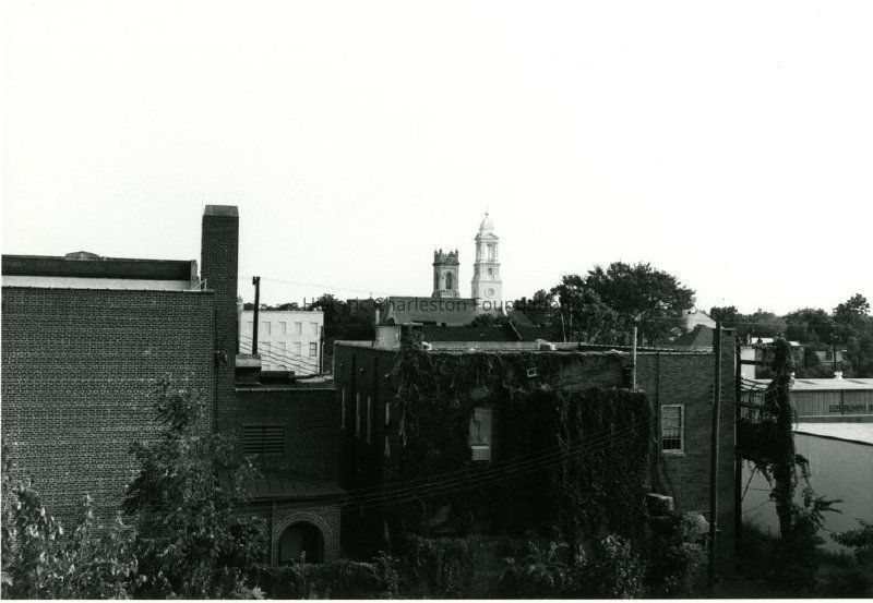 m: Aerial view looking southwest from Market Street near King Street toward Archdale Street. Tops of St. John's Lutheran Church and the Unitarian Church in background.