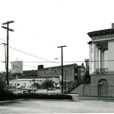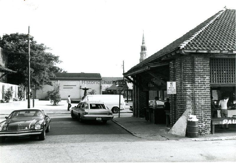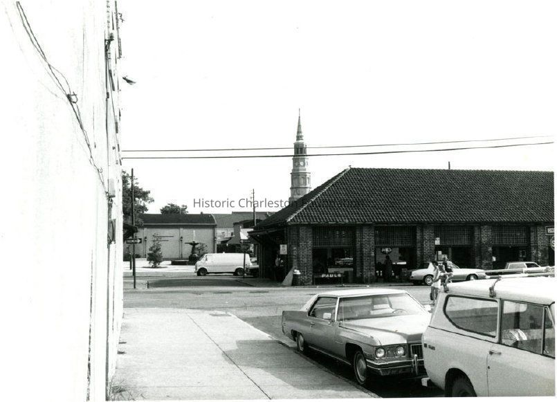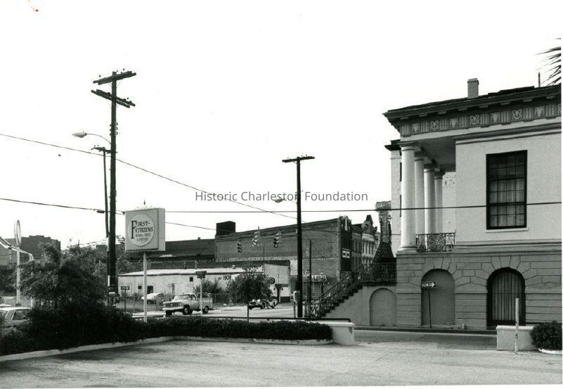 v: Looking northwest from the parking lot of First Citizens Bank at the corner of South Market Street and Meeting Street. Southern elevation of Market Hall at right. Also features the buildings at the northwest corner of Meeting and Market.