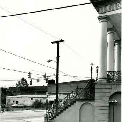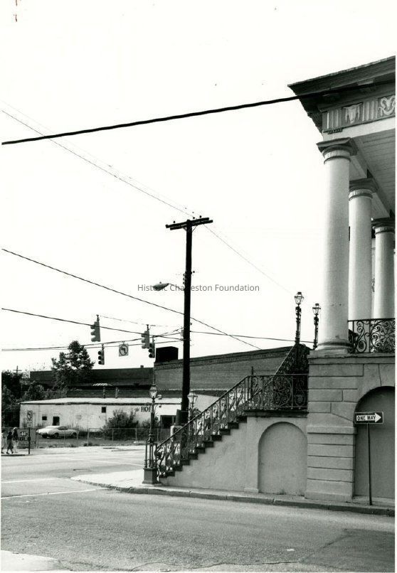 w: Looking northwest from the corner of South Market Street and Meeting Street. Columns and stairs to market Hall in foreground. Also features the buildings at the northwest corner of Meeting and Market.Collection