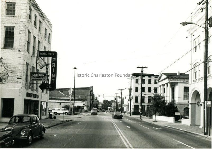 u: Looking north from the intersection of Meeting Street and Market Street. Madren Paint Co. (177 Meeting) at left; First Citizens Bank, Market Hall, and 112 North Market at right.