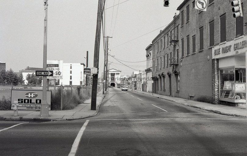 b: View looking east on Market Street from the junction of King Street and Market, from the vacant lot where Belk Department Store once was (left) and 220 King Street (Blue Knight Gallery) (right) down to Market Hall in distance. Meeting Street elevation of the Arnold-Hornik Building (112 North Market) also in distance. "Sold" sign on fence surrounding the lot, which is now the site of Charleston Place / Charleston Center. (Similar view as MARKET.GEN.2.)