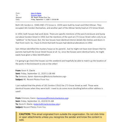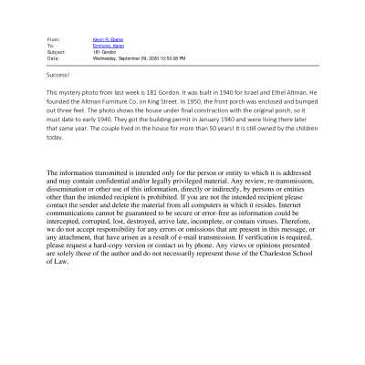 a: 181 Gordon Street under final construction with the original porch. It was built in 1940 for Israel and Ethel Altman, who lived in the house for more than 50 years. Israel Altman founded the Altman Furniture Co. on King Street. In 1950, the front porch was enclosed and extended out three feet. The house remains in the family. An almost identical house is located at 273 George Street.