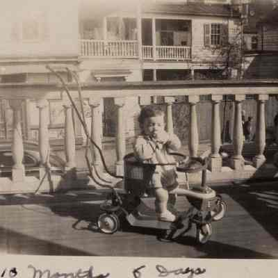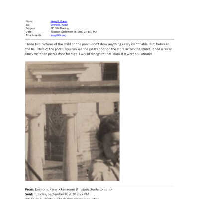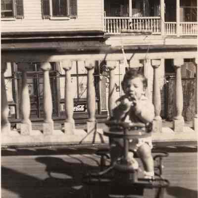 d-e: Toddler on the front porch of 123 Coming Street. View of 124 Coming Street in background.
