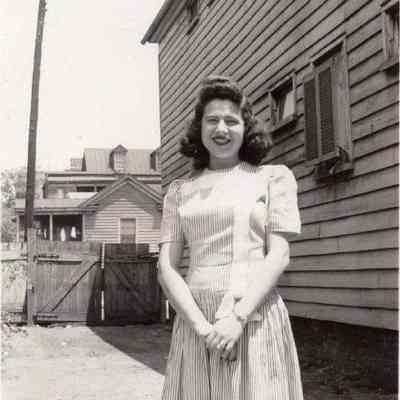 c: Woman stands by the side of an unidentified house. View of the house across the street in background.