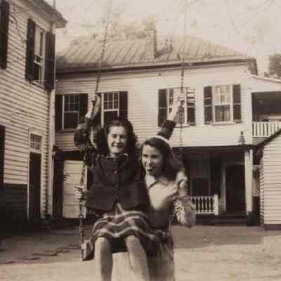 f: Two girls on a swing sets in the backyard(?) of an unidentified house. "[19]45 Hinky & me" written on back of photo.