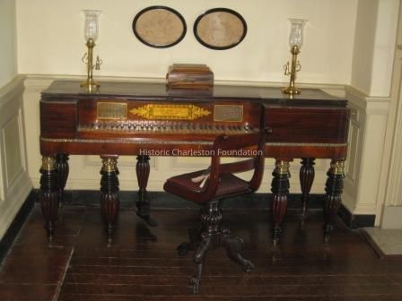 of Carved Inlaid and Brass Mounted Mahogany and Rosewood. Made By Robert and William Nunn For Dubois and Stoddard, New York, C.1825. Rectangular Case with Hinged Flap To Expose Keyboard, Back Inscribed with the Manufacturer's and Retailer's Names, the Case Banded with Repousse Brass Border. on Six Massive, Ring Turned and Reeded Tapering Legs with Brass Capitals, with CastersCollection