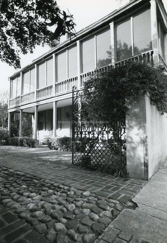 B&W photograph of the piazzas of the William Elliott House (75 King Street), viewed from the foot of the driveway, showing the iron gate.Collection