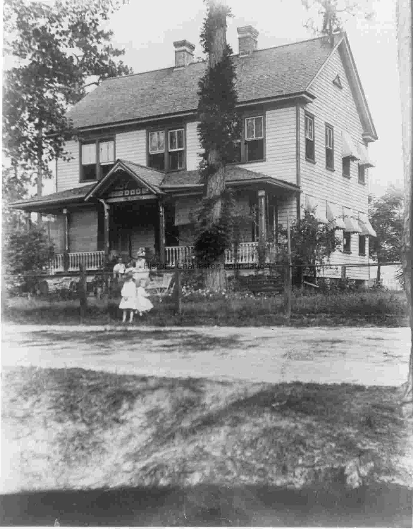 B&W photograph of people standing in front of a two-story house identified as "pine cottage," Summerville.Context