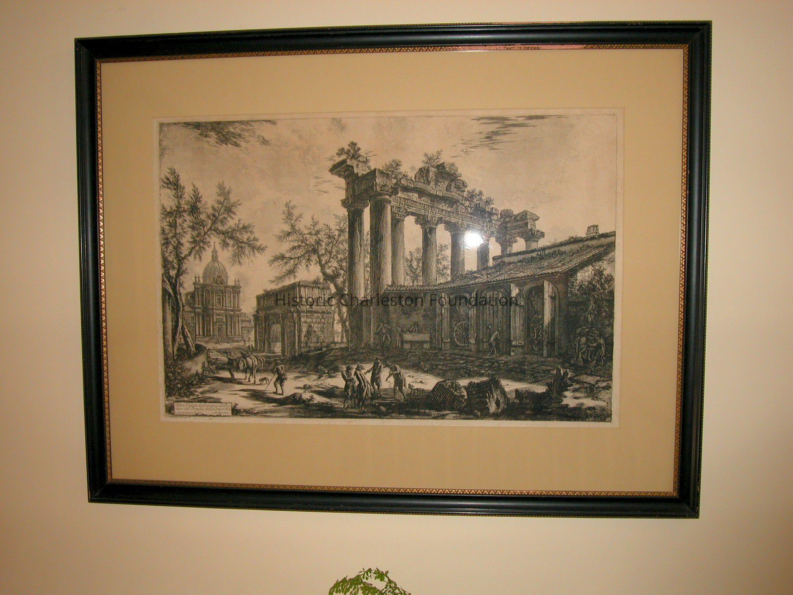Piranesi Print of Carriage House in the Shadow of Large Collonaded Ruin, the Tempro Della Concoria. Domed Building on Proper Left. Inscription on Lower Left Reads: Altra Veduta Degli Avanzi Del Pronao Del Tempro Della Concoria. Black Wood Frame with Outer Edge of Thin Beaded Gold Edge with Heavy Gold Border Near Inner Edge.Collection