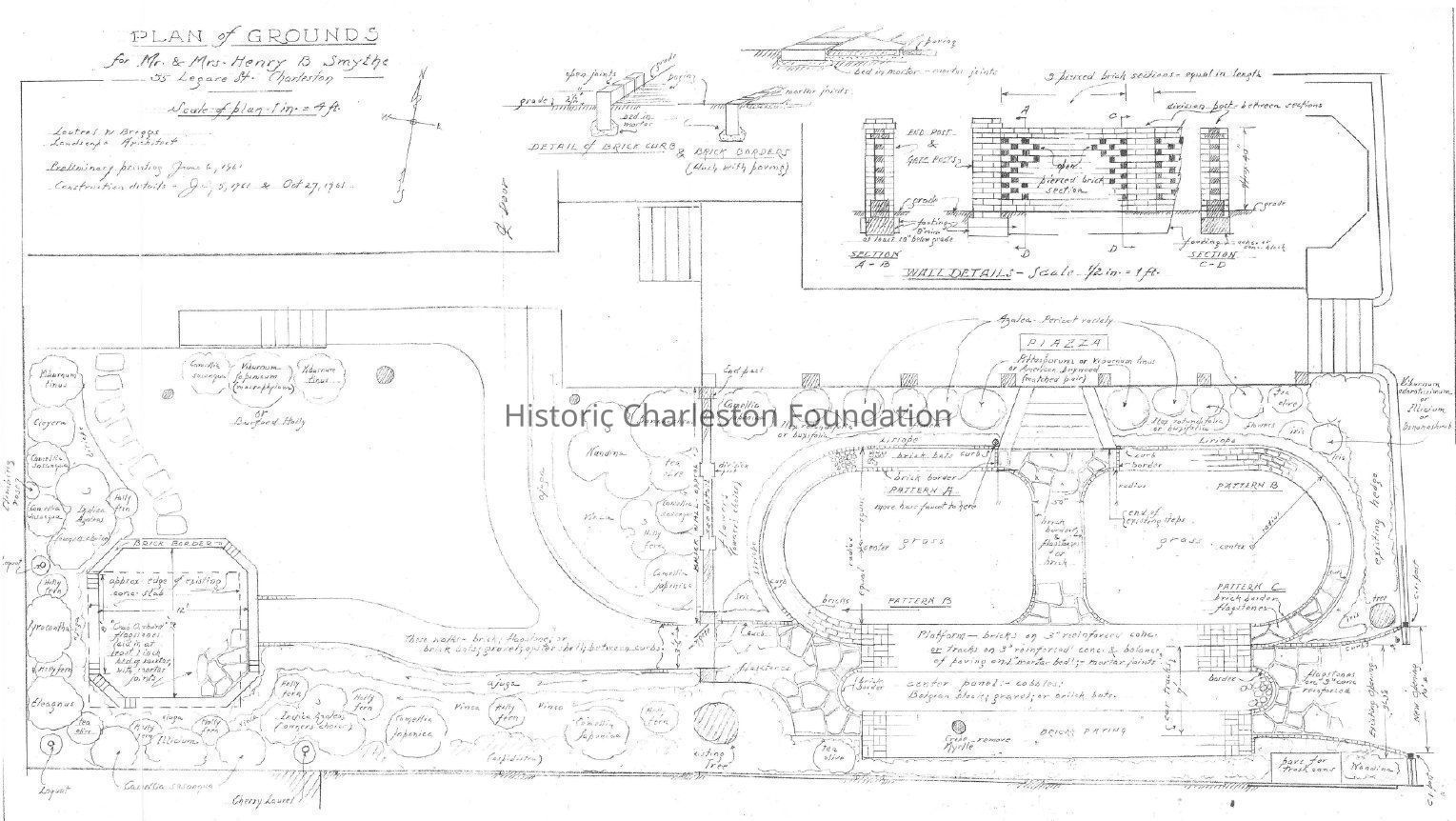 Includes detail of brick curb and brick borders; wall details and section; and names of plants.