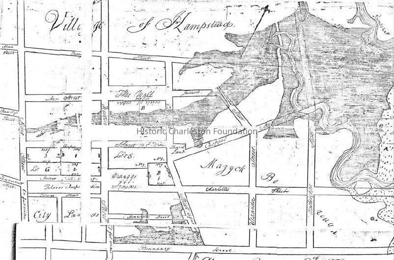 Shows Village of Hampstead and Mazyckborough and the area bounded by Mary Street, King Street, Boundary Street, and the Cooper River.