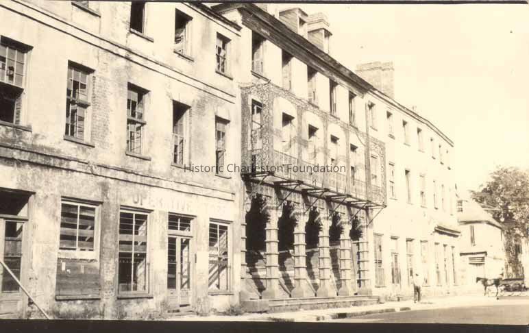Photograph (scan) featuring the Planters Hotel (Dock Street Theater, 135 Church Street). Exterior, street elevation, with adjacent buildings visible, looking north on Church Street.Photograph Details
