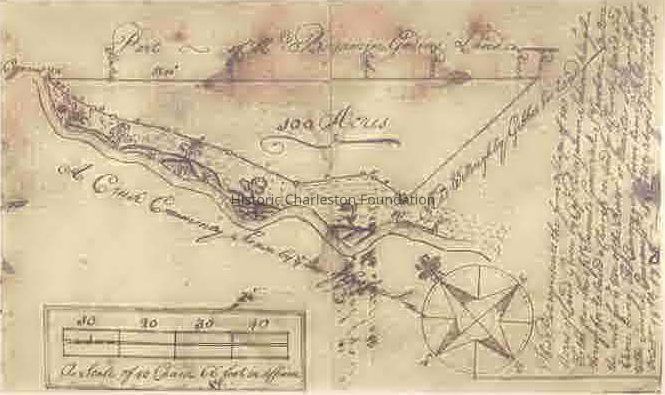 This plat represents the form and shape of 100 acres of land given by Cap. Benjamin Schenckingh(?) to the parish of St. James's Goosecreek, So. Carolina. One acre thereof for to build a church on and for a church yard and the next for a use of the Rector or Minister of (?) parish for a time being, the conveyance from him (?) Schenckingh to the Church Cons(?) [illegible] above being dated October 18th, 17??.Notes
