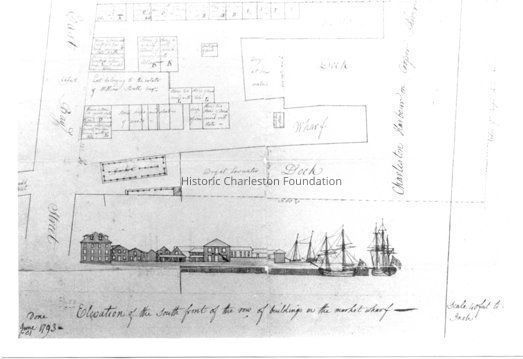 Photographic reprint of a plat showing East Bay Street houses at and just north of Tradd Street. Also features nearby wharves and docks on the Cooper River, including Market Wharf [today South Adger’s Wharf], with a drawing (elevation) of the south front of the row of buildings on Market Wharf. Dated June 1793.Collection