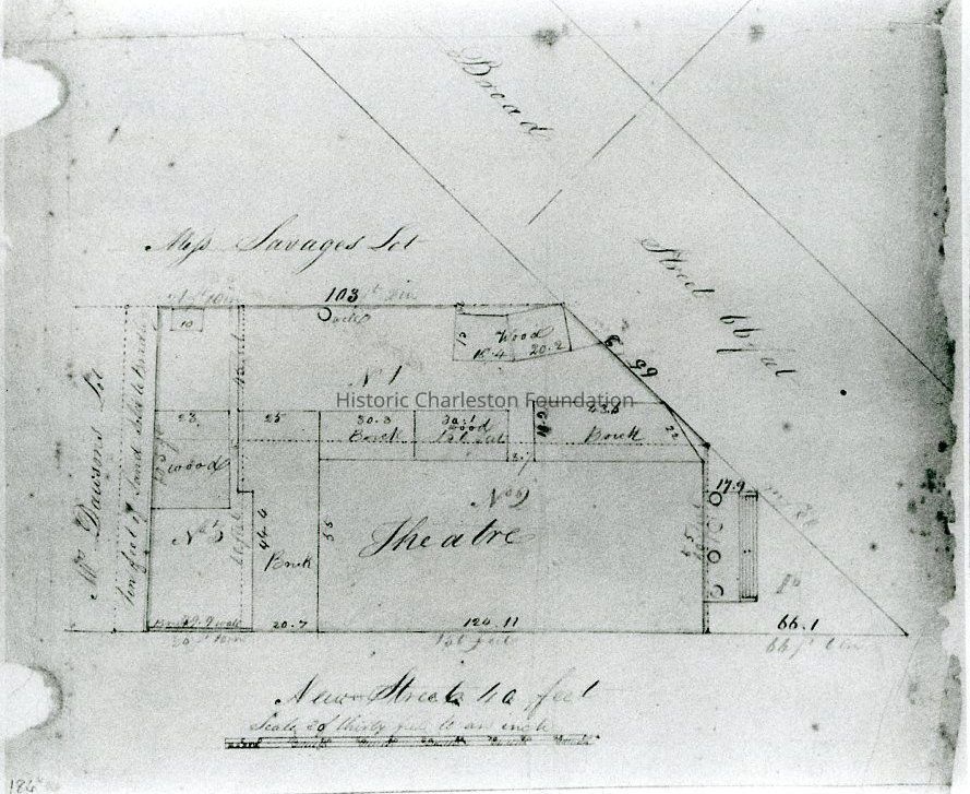 Photographic reprint of a plat showing the Charleston Theater on the site of what is now 157 Broad Street. The site is bounded on three sides by New Street, Broad Street, and Savage Street, with "Mr. Dawson's lot" abutting to the south. Plat is unattributed.Collection