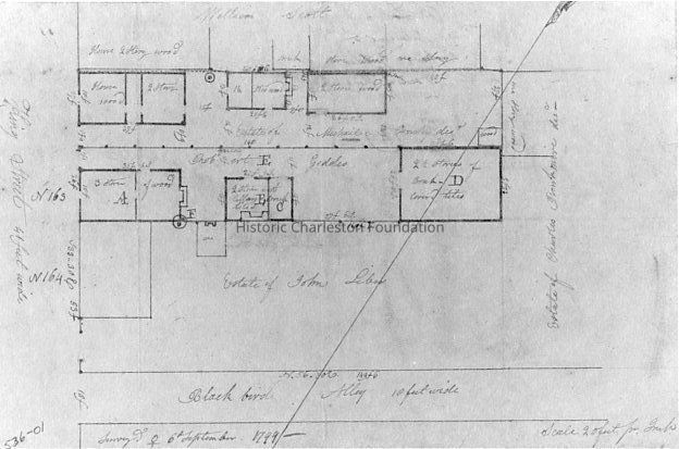 Burns Lane was established by 1801. Small tradesmen and laborers lived in Blackbird Alley, later named Burns Lane, through the 19th century. Most of the small dwellings have been removed, but the scale and finish of 20 Burns Lane are indicative of some of those buildings that were demolished. The Horlbeck family built this house before 1852, as well as the building at 22 Burns Lane, possibly an outbuilding to a Horlbeck house that faced Calhoun Street. The structure at 21 Burns Lane was built as an inexpensive tavern or brothel by 1820 and formerly contained more than ten fireplaces. As a tenement occupied by black families until the mid-20th century, the structure was renovated with additions by a developer in 1987. (Buildings of Charleston, p. 426.)Collection