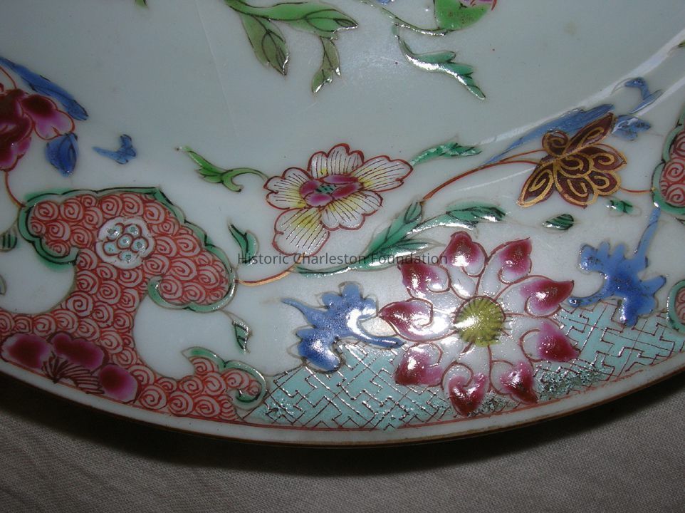 Circa 1740-70, Descended in the Dehon Family, Elaborate Design Depicting a Crane Flanked By a Bowl of Fruit and a Turquiose Vase on Stand. the Decoration in Overglaze Famille Rose Enamels with a Gilt Edge and Overglaze Gilding on the Bird and Selected Border Flowers. No Markings on Reverse Paper Label Attached That Reads From the Nathaniel Russell Home in Charleston, About 1760Collection