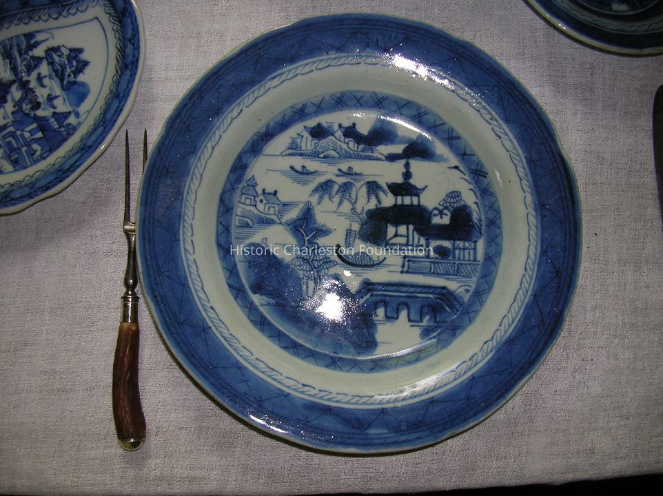 One of three soup bowls/plates. Blue and White Canton Ware, Chinese Export Porcelain