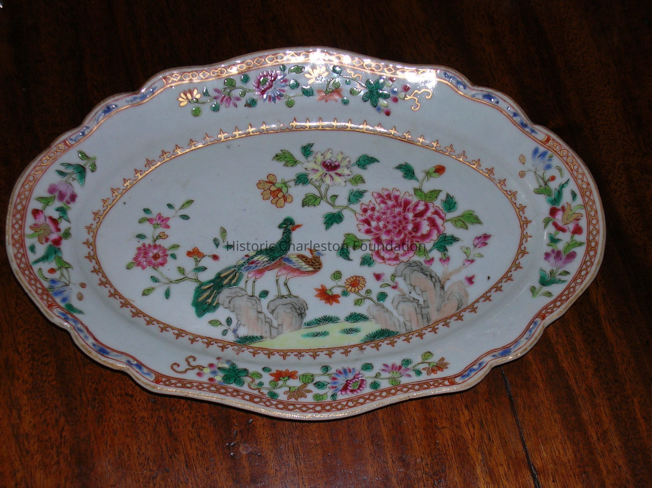 "Double Peacock and Peony" pattern, Chinese Export Porcelain in the Famille Rose palette with gilt highlighting. Part of a larger dinner service.