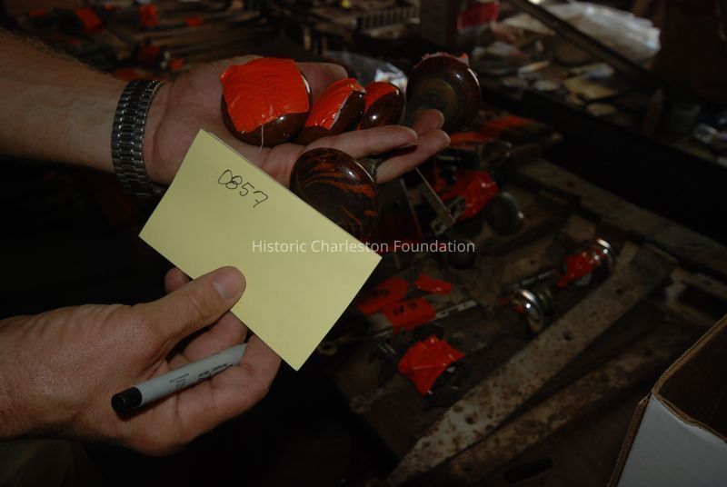 One of two complete porcealin doorknob sets, brown, with a swirled pattern.Collection