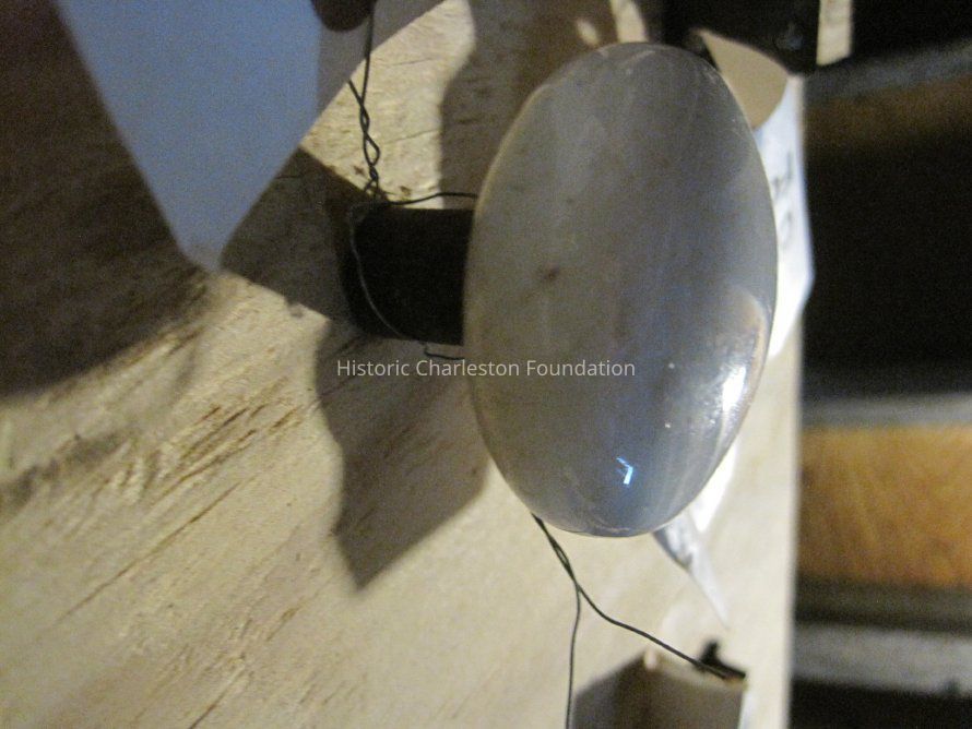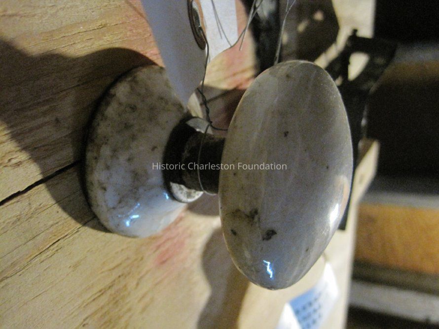 Two porcelain doorknobs from a group.* Each knob is white porcelain.