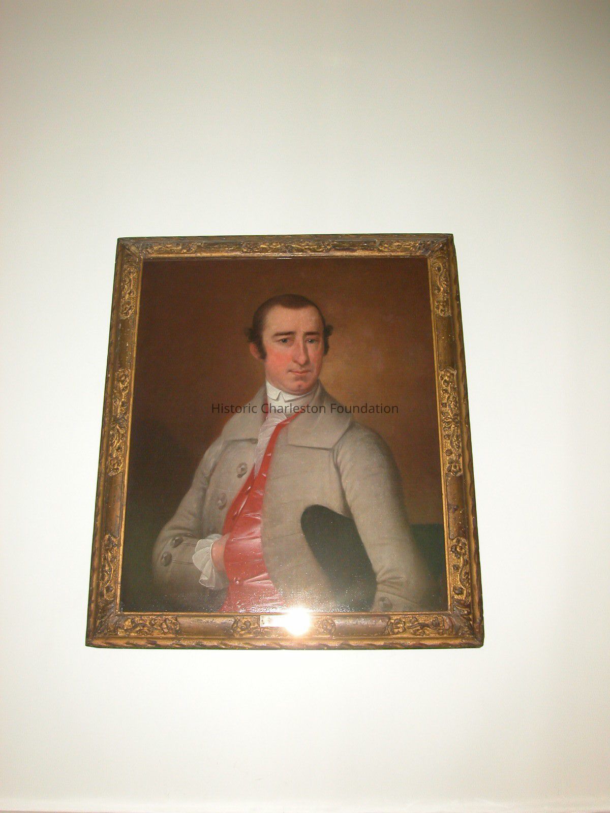Portrait of Daniel Ravenel of Chelsea (1734-1774) By Jeremiah Theus, Half Length Portrait with Brown Background. Subject Sits with Left Shoulder To Foreground, Head Turned To Left. Right Hand Placed in Waistcoat. Black Tricorn Hat Under Left Arm. Wearing Grey Great Coat, with Grey Bottons, Red Waistcoat, White Stock and Ruffle. White Ruffle At Cuff of Right Hand. in Carved Gessoed and Gilded Rococo Frame, Probably of Charleston Manufacture.Collection