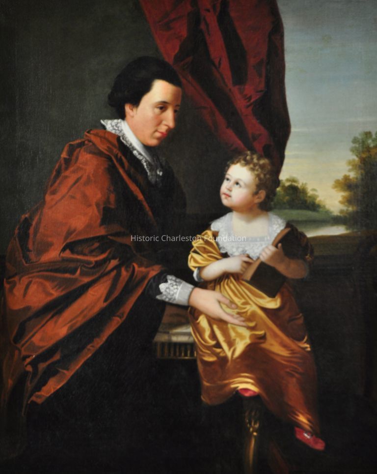 Benbridge painted Thomas Middleton (ca. 1750-1779) of Crowfield Plantation and his daughter Mary (1775-1816) in fanciful drapery-like dress. The richly colored and deeply shadowed fabrics highlight the faces of father and daughter. While the pose of the sitters is reminiscent of classical compositions, the romanticized landscape in the background attests to European neoclassical tastes fueled by the undercurrents of the Enlightenment.