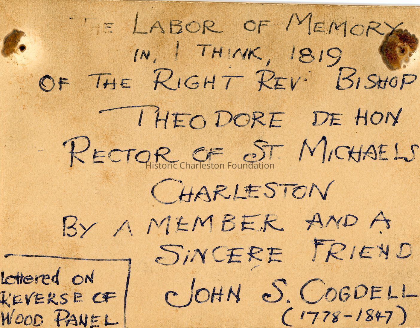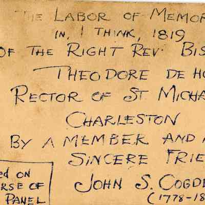 The Labor of Memory In, I Think 1819, of the Rt. Rev. Bishop Theodore Dehon, Rector of St. Michael's Charleston, By a Member and a Sincere Friend John S. Cogdell (1778-1847)Language