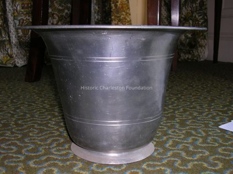 Commode or chamber pot, Pewter, made in England, signed C & S, mark for Crane and Stinton of Bewdley. Flared flat rim, tapered, straight sides, and flared foot-rim.Collection