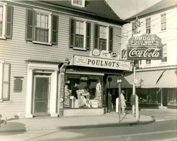 B&W photograph of Poulnot's Drug Store, "America's Oldest Drug Stand," at 106 Broad Street [John Lining House], south elevation (storefront), showing the corner of King and Broad Streets. King Street elevation of Berlin's at right. Two woman stand near the corner.Collection