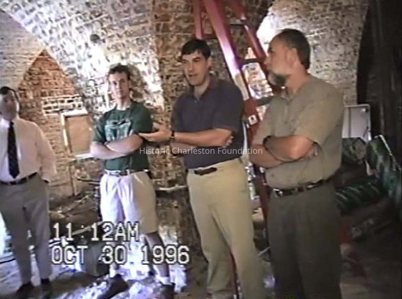 Video footage (DVD) featuring the interior restoration of the Powder Magazine. Richard (Moby) Marks demonstrates work including masonry restoration and is presenting the project status to architect Glenn Keyes and HCF staff Carter Hudgens, Jonathan Poston, Jim Crow, and others. Recorded on Oct. 30 and Nov. 4, 1996.