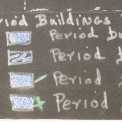 Copies of Sanborn Map pages combined to study maps of various areas in Charleston. Color-coded to depict building status. See image #2 or Media tab for color key.