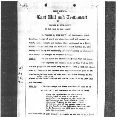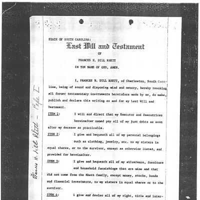Probate documents for I'on L. Rhett, and documentation relating to the settling of the estate of Francis Dill Rhett, including her Last Will and Testament and various itemized statements of her personal and real property, particularly furniture and jewelry.