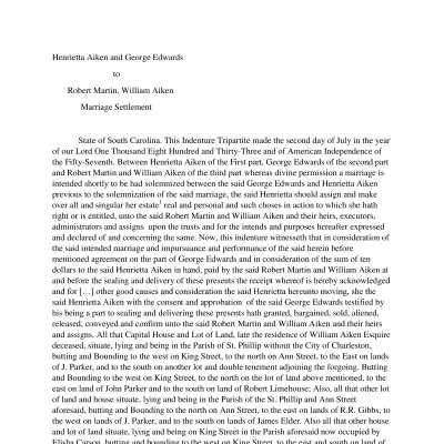 Documents, both legal and personal, relating to the marriages of Aiken and Rhett family members. Includes the 1833 marriage settlement between Henrietta Wyatt Aiken and her second husband George Edwards (see Media link for transcript), and an 1862 letter from Andrew Burnet Rhett to his brother regarding preparations to be made for his impending marriage to Henrietta Aiken.