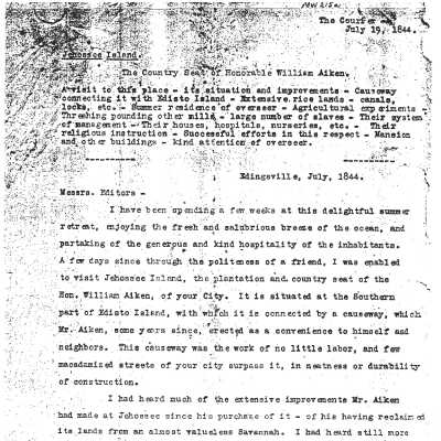 Transcript of a chapter in the account of N. H. Bishop's 1870s journey from Canada to the Gulf of Mexico in a canoe for the purpose of providing the United States Coast Survey Bureau with maps of the American coastal region, during which he visited "Governor Aiken's model rice plantation," Jehossee.