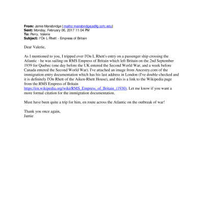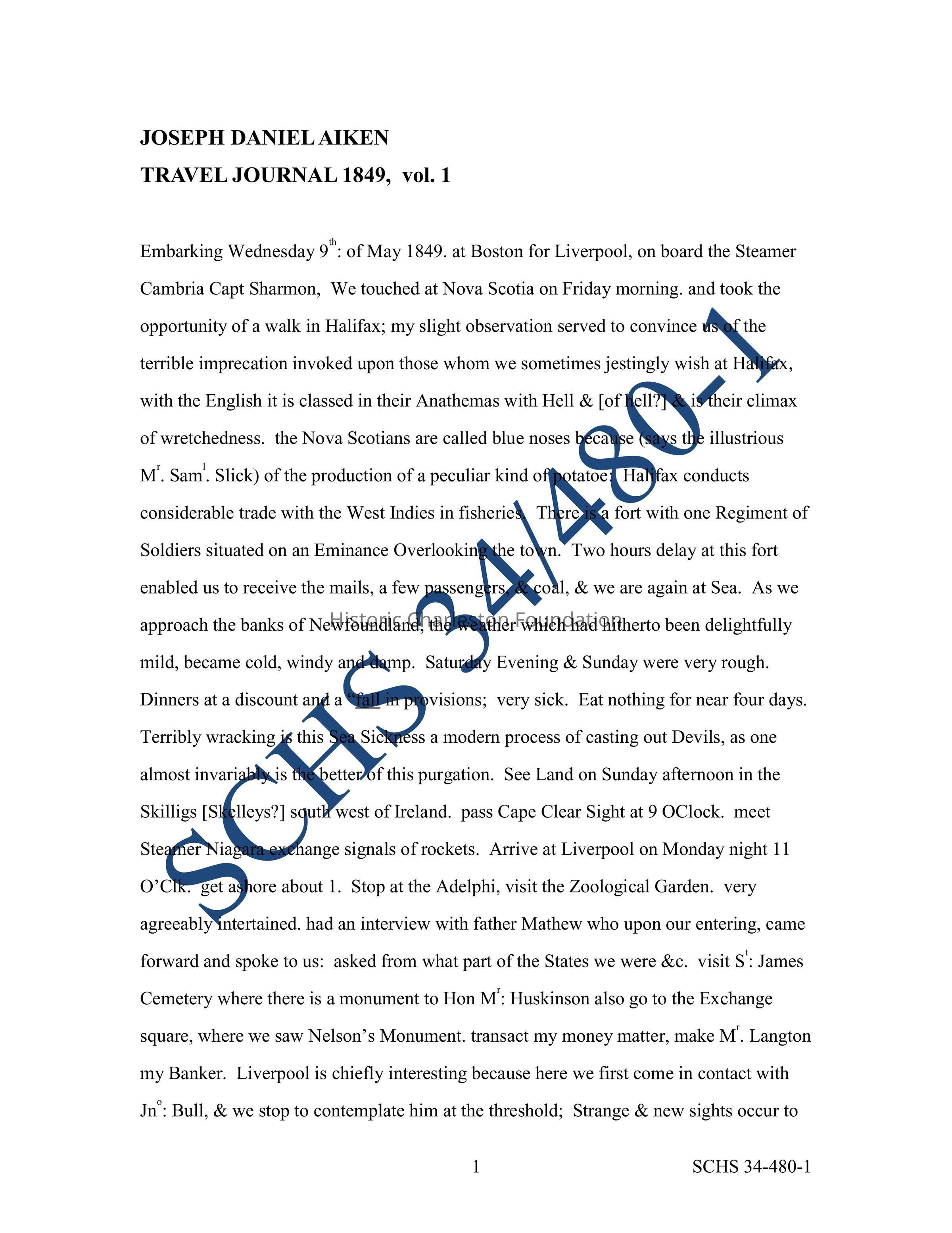 Various letters, diaries, and other personal papers of family and non-family members which relate directly to the Robinson, Aiken or Rhett families or their properties. Among these are excerpts from Mary Boykin Chestnut's diary; military correspondence describing a visit to Jehossee Plantation; an 1839 letter to Francis Kinloch Middleton regarding a party at the Aiken (Rhett) House [MISSING]; transcript of the Joseph D. Aiken's travel diary (see Media link, original at SCHS); passenger list showing I'on Rhett aboard the RMS Empress of Britain.