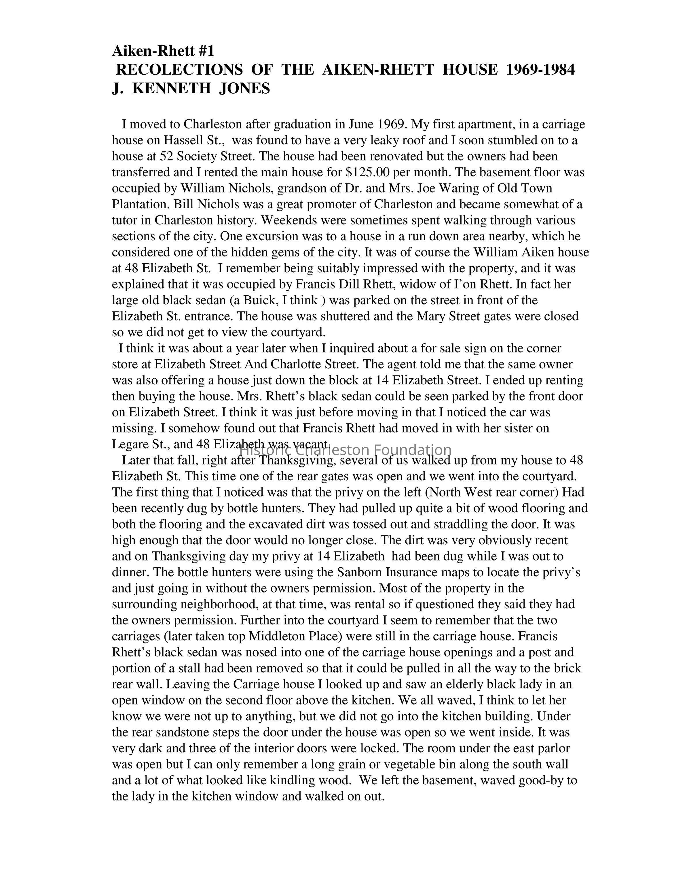 Folder 15: "Recollections of the Aiken-Rhett House, 1969-1984," by J. Kenneth Jones, former Curator of Decorative Arts and Cultural History.