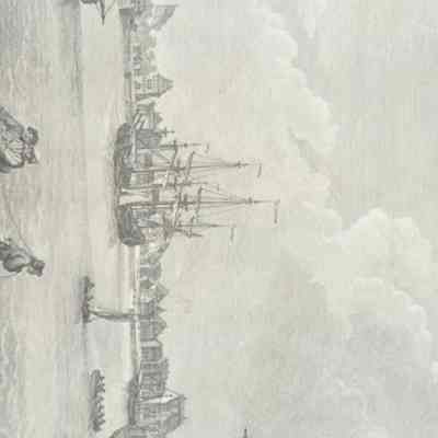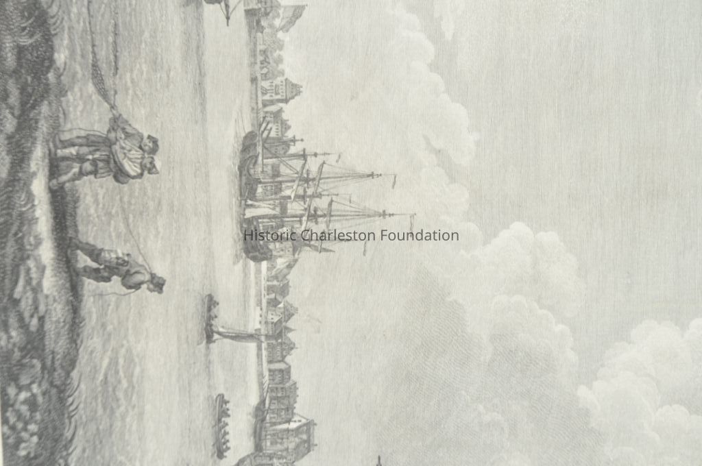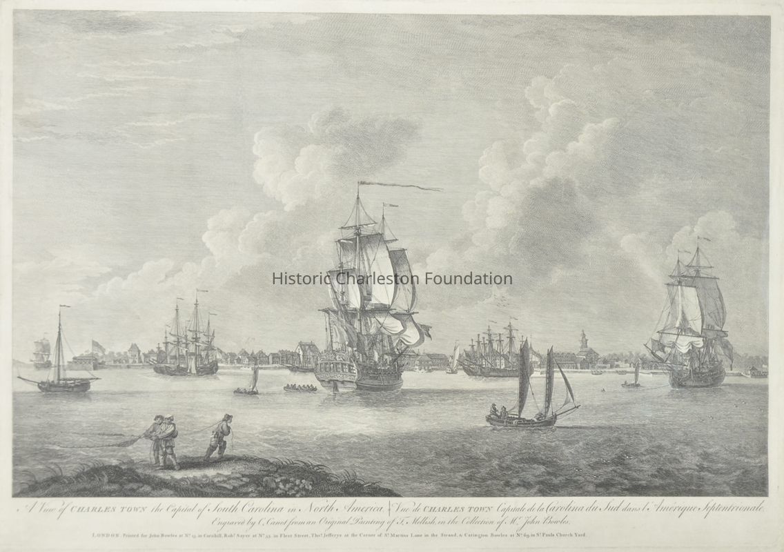 Mellish, Thomas. "A View of Charles Town the Capital of South Carolina in North America." Engraved by C. Canot from an original Painting by T. Mellish, in the Collection of Mr. John Bowles. London, Printed for John Bowles, Robert Sayer, Thomas Jefferson and Carington Bowles {1768}. Black and white copper-engraving. Appeared in the Scenogaphia America. The view shows Charleston from the opposite bank of the Cooper River. Granville Bastion, a lower tip of the city, can be seen at far left; St. Phillip's Church at far right. Numerous other building can be identified, and the artist has emphasized the commerical prominence of the city through the inclusion of numerous large sailing ships in the harbor.Collection