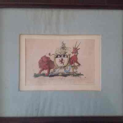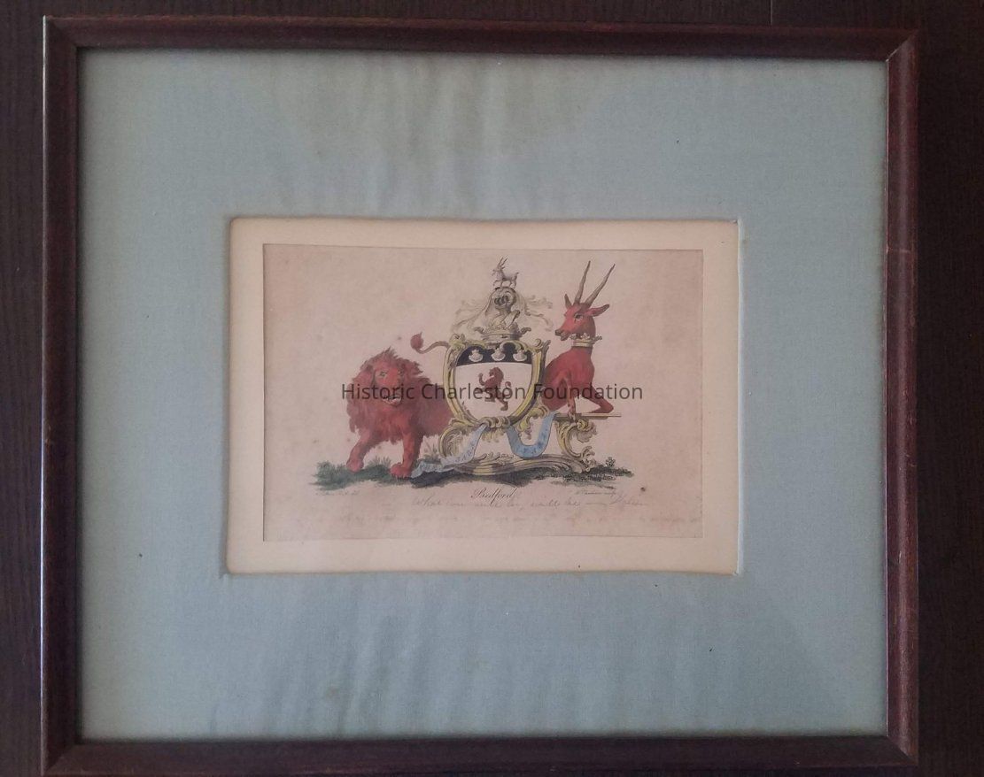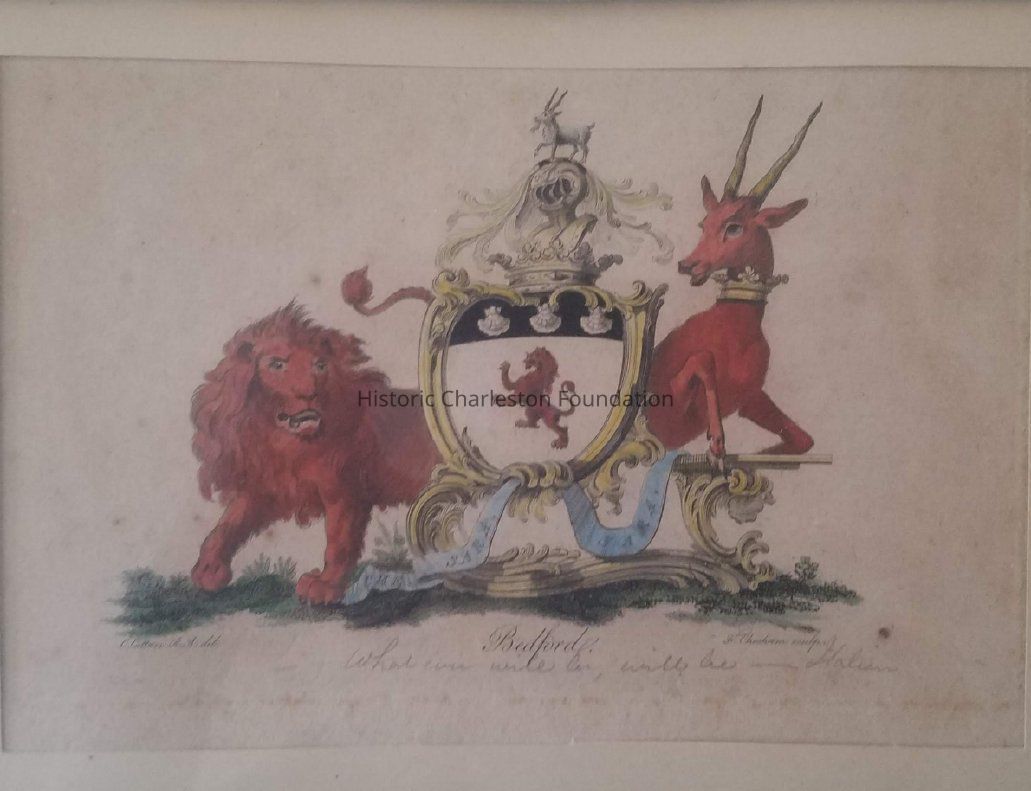 Print of coat of arms of Russell Duke of Bedford, landscape. Blue ribbon inscription "Che Sara Sara." Written below coat of arms on the left side "C. Catton R. A. Del." , in the center "Bedfords," and on the right side "Fr. Chesman Sculp." Written in pencil below Bedfords "Whatever will be, will be.--- Italian," translating the blue ribbon writting.Collection