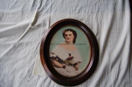 Oval-framed photograph of Harriet Lowndes Rhett holding flowers and set against a blue background.Collection