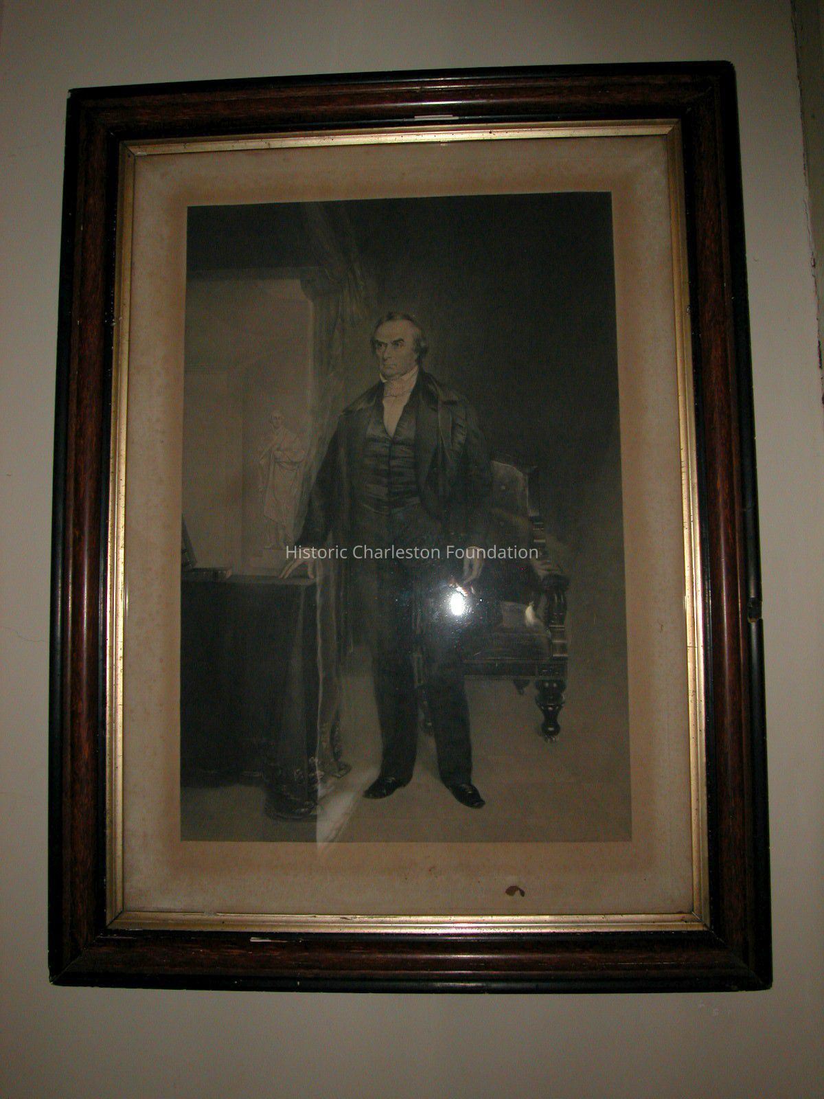 Image depicting full figure of standing man wearing black suit with vest, white shirt and neckercheif, black coat and shoes; right hand resting on table covered with cloth having flower and leaf border decoration, 2 books on table; behind Webster is armchair having shaped mahogany crest rail, upholstered back and seat, shaped molded and padded arms, on bulbous turned legs on casters; statue of Jefferson in Rotunda in background; in molded wood frame with gilt inner border and ebonized outer border.