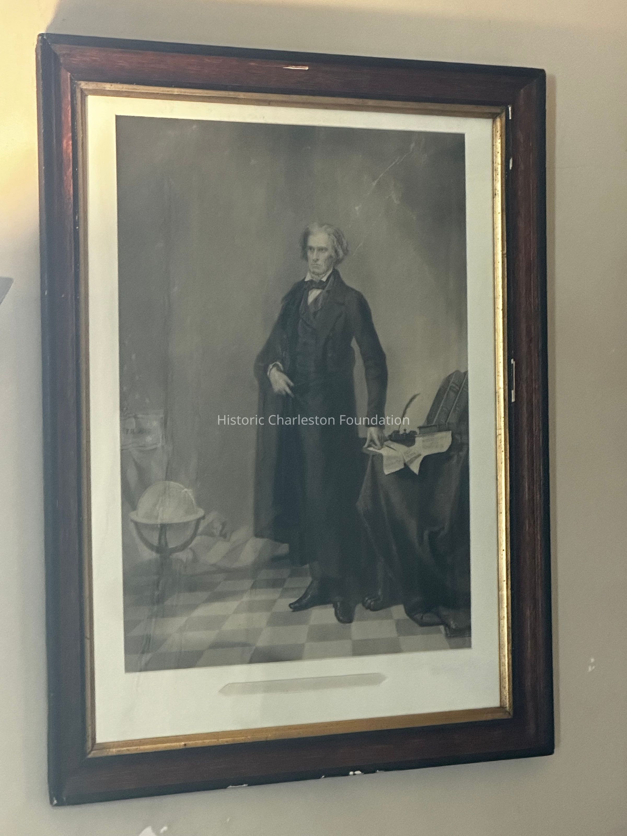 Image depicting full figure of Calhoun standing and wearing black suit with white shirt and long black coat, right hand holding belt of coat and left hand leaning on table, table covered with cloth nd having paw feet - papers on table reading 'Strict Construction', 'Free Trade', and 'The Sovereignty of the States', volumes of 'Jefferson's Works' on table next to papers; globe on stand in left corner of room in front of American flag; in molded wood frame with gilt inner border and ebonized outer border