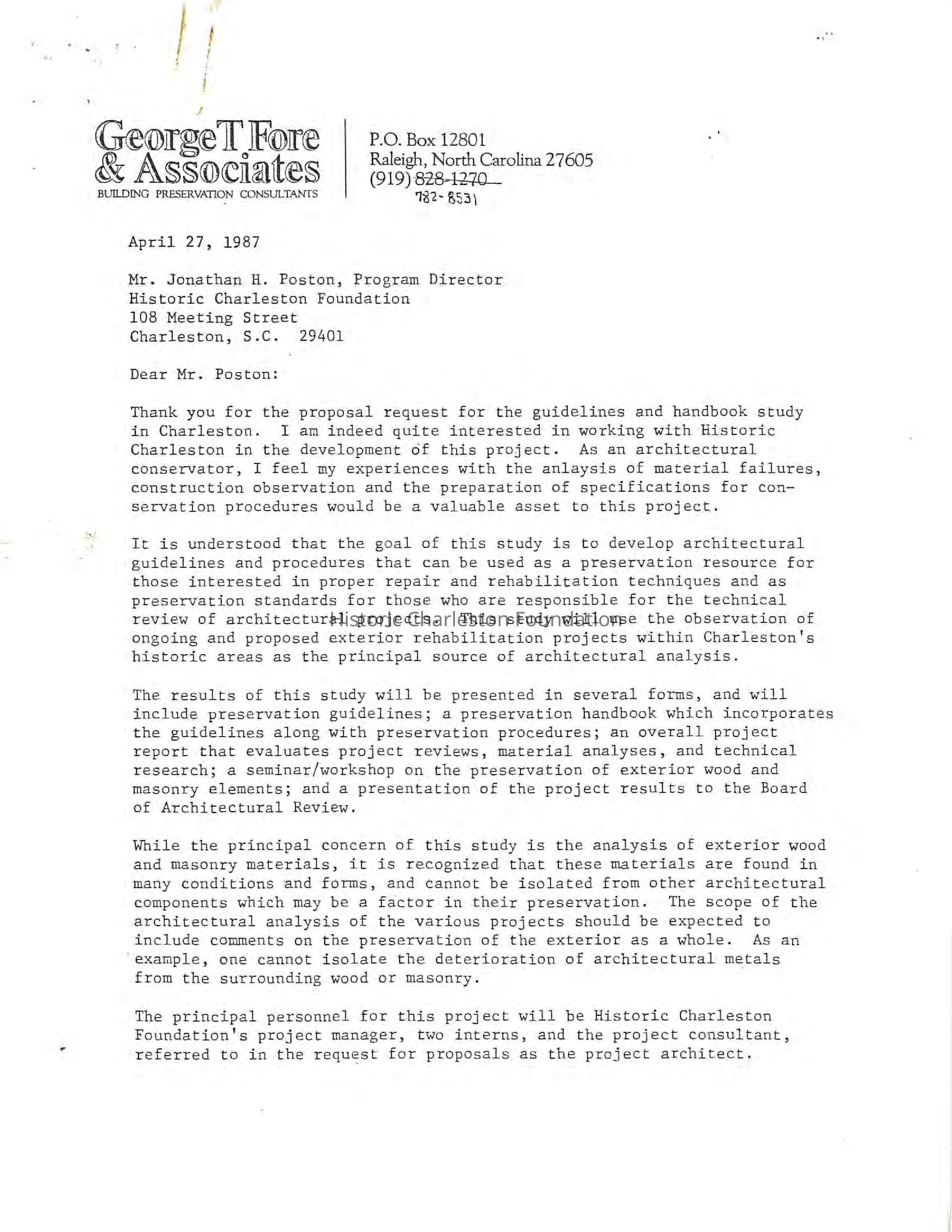 Initial letter from George Fore to HCF describing the scope of the wood and masonry preservation guide.