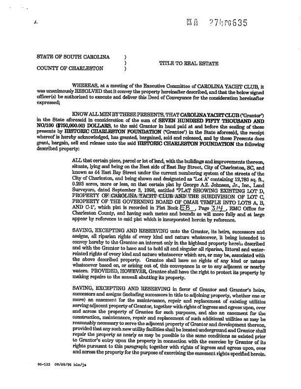 Preliminary correspondence pertaining to the purchase of "three-story brick Shrine office building on East Bay Street" and documentation of the transactions: Mortgage Note, Contract between Carolina Yacht Club and Historic Charleston Foundation, Reciprocal Agreement, Purchaser's Closing Statement, and Plat Showing Existing Lot D, Property of Carolina Yacht Club, and the Subdivision of Lot C, property of the Governing Board of Omar Temple into Lots A, B, and C-1 (George AZ Johnson, 9/3/1996).Container