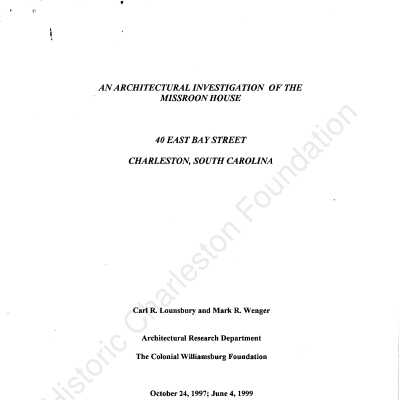 File contians "A Conditions Survey of the Basement of the Historic Charleston Foundation Quarters Missroon House," by 4SE, Inc. (Lyles McBratney, Ty Atkins, Craig M. Bennett, Jr.) with brief description of the building; findings (condition of brick masonry walls and piers, wood floor joists and girders, reinforced concrete slab); conclusions; and photographs of the exterior of the Missroon House and of the basement interior. Also contains email from Winslow Hastie regarding the 2017 repairs to the building.Date(s) of Creation