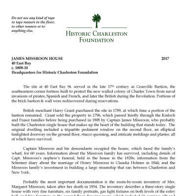 Missroon House (Charleston, S.C.)--Conservation and restoration, Historic Charleston FoundationNotes