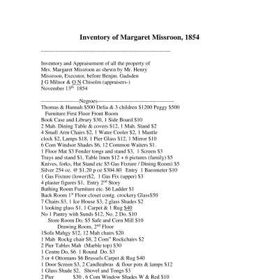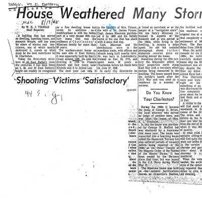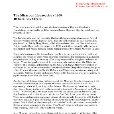 Property file contains building history (Pemberton, 2017); FOHG house histories (ca. 2001, 2017); HCF memorandum regarding the status of research (1997) and a related research report (undated); chain-of-title and related deed and city directory research; "plan of a "wharf and channel lot" (1804) and Sanborn maps (1884, 1888, 1924); report "An Architectural Investigation of the Missroon House (Lounsbury & Wenger, 1997, 1999); article "Notes on Granville Bastion (Lapham, 1925); newspaper articles (including 1930 and 1968 DYKYC); Inventory of Margaret Missroon (1854); Missroon House Furnishings (2001); land conveyances, advertisements, and other research materials related to Hary Grant; photocopies of photographs including two ca. 1900 photo with notes about the house's history and the family who resided there; "The Saga of Family Missroon" (transcript of manuscript by Rutledge Parker Butler); HCF correspondence related to Omar Shrine Temple's application to build a parking deck (1976).Container