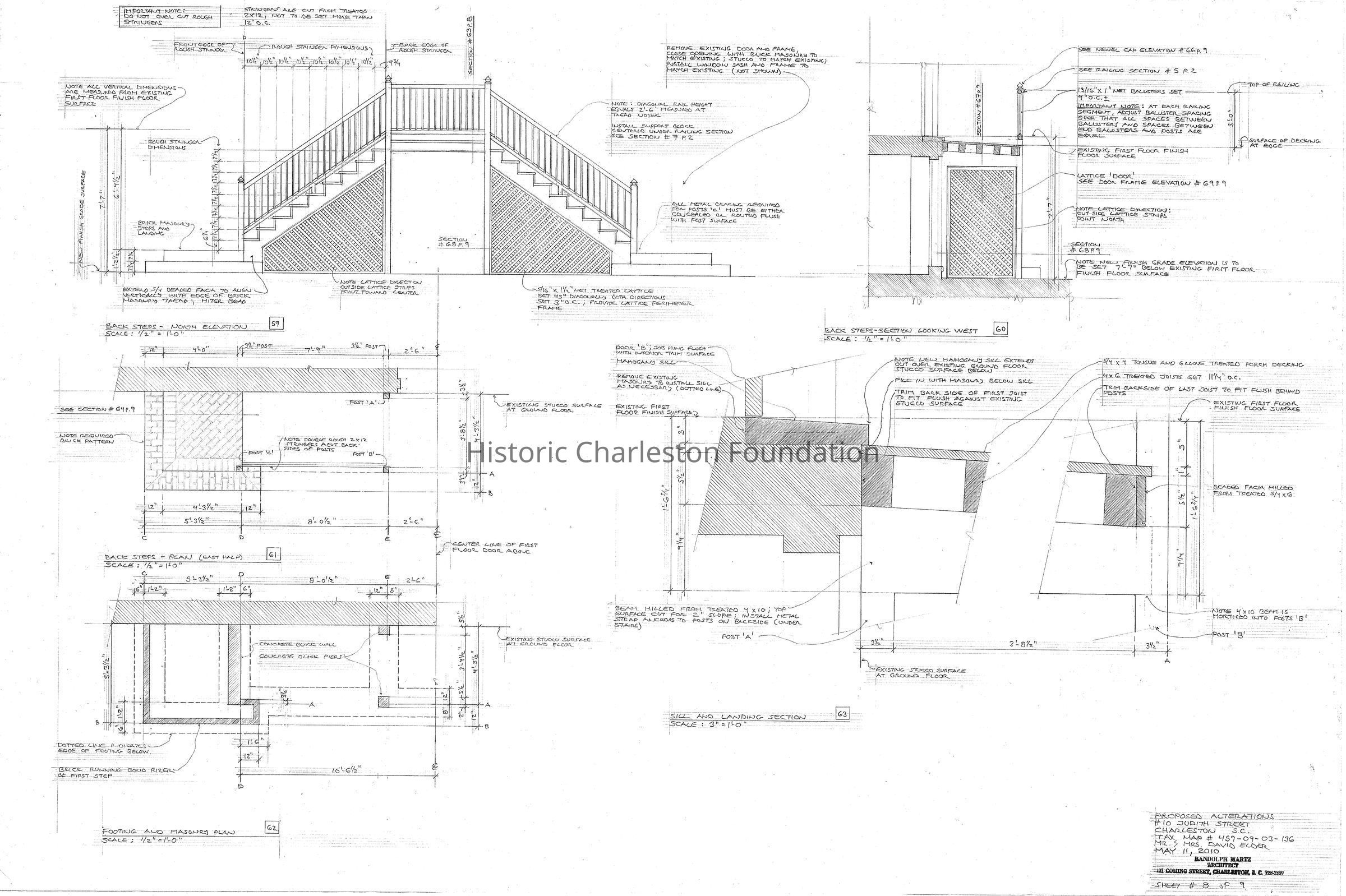 Elevations, sections, details, plans: back steps, footing and masonry, sill and landing, brick steps and stoop, lattice door, post cap, riser, skirt.