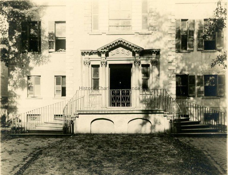 B&W photograph of the lower portion of front of the Judge King House (a/k/a Radcliffe-King Mansion), featuring the double staircase with wrought-iron balustrade rising from the walkway to the landing, and the elaborate doorway. The house was located at the northwest corner of Meeting and George Streets.Collection